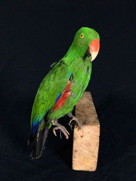 Grand éclectus (Eclectus roratus) (II/B) : spécimen mâle naturalisé sans socle, en l’état