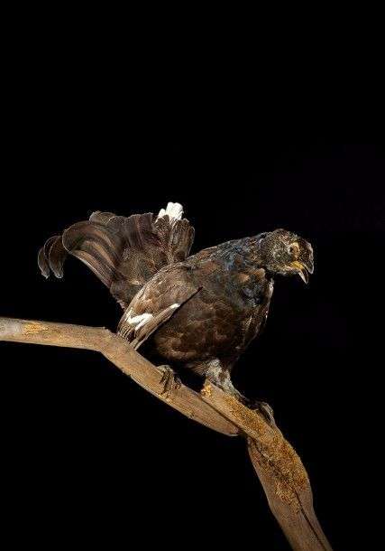 Tétras lyre (Tetrao tetrix) (CH) : spécimen ancien mâle en parade naturalisé sur branche