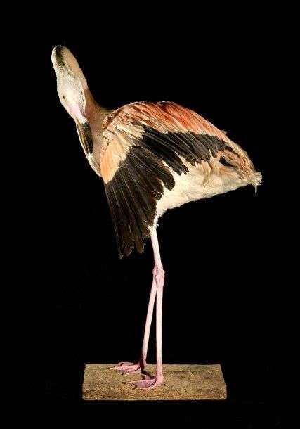 Flamant rose européen (Phonicopterus ruber) (II/A) : spécimen présenté sur socle en attitude de nettoyage