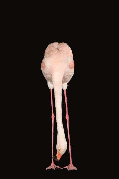 Flamant rose européen (Phonicopterus ruber) (II/A) : spécimen naturalisé sans socle en position d’alimentation