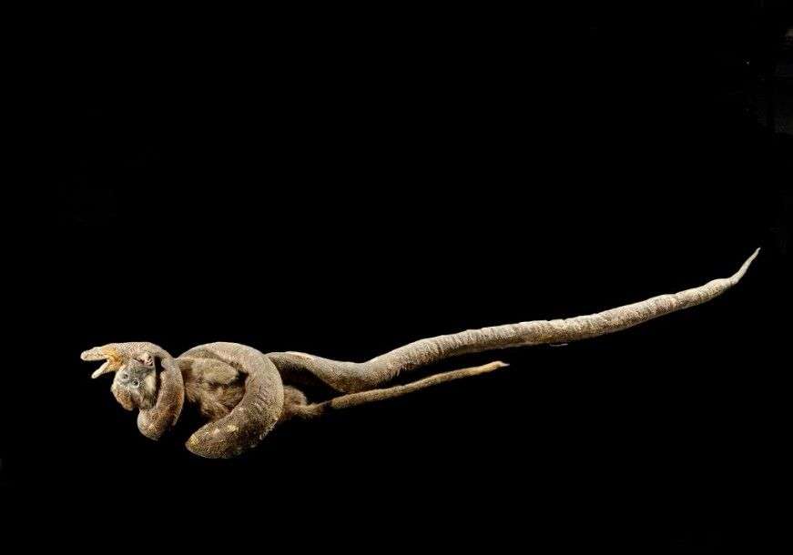 Python de seba (Python sebae) (II/B): belle scène d’un combat entre un Grivet ou singe vert (Chlorocebus aethiops) (II/B) et un Python de seba, accidents, en l’état
