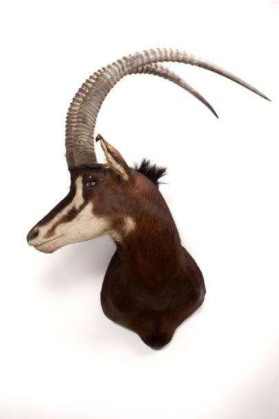 Hippotrague noir (Hippotragus niger) (CH) : tête en cape avec belle envergure et configuration du trophée, oreille abîmée