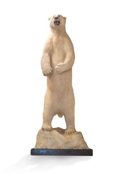 Ours polaire (Ursus maritimus) (II/B) : très beau spécimen naturalisé sur socle en station bipède gueule ouverte reconstituée (fausse dentition). Ce type de spécimen au vu de sa taille est de plus en plus rare dû à la raréfaction de cette espèce dans son milieu naturel.