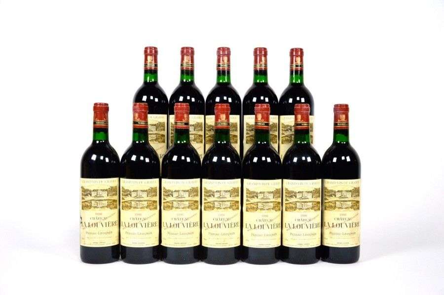 12 B CHÂTEAU LA LOUVIERE Rouge (Caisse Bois) 3 B.G| e.t. légères à e.t. dont 1 e.l.a. et 1 e.a. Pessac-Léognan 1986