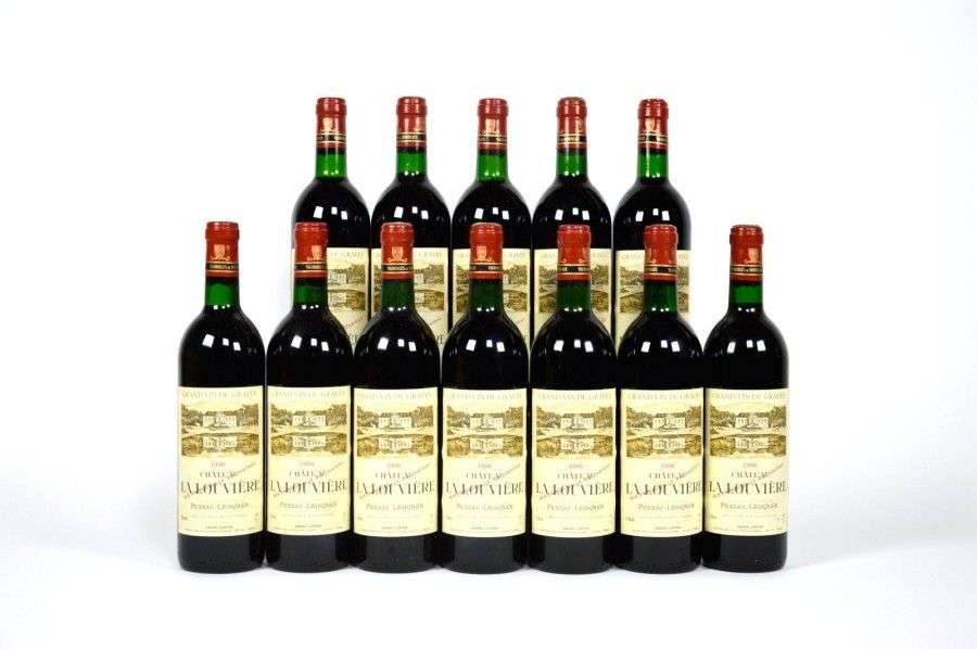 12 B CHÂTEAU LA LOUVIERE Rouge (Caisse Bois) 6 B.G| 1 T.L.B| 1 e.a| quelques capsules légèrement gonflées. Pessac-Léognan 1986