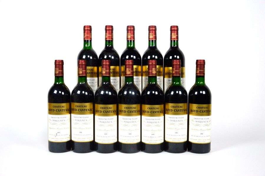 12 B CHÂTEAU BOYD CANTENAC (Caisse Bois) 2 B.G.-| 3 H.E.+| e.l.s. à e.t. légères. GCC3 Margaux 1985