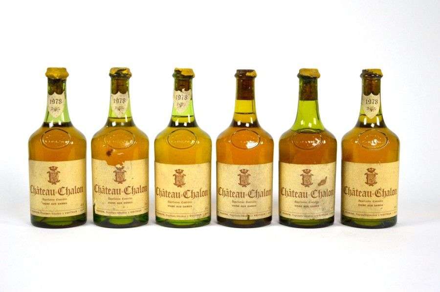 6 B CHÂTEAU CHALON VIGNES AUX DAMES (2 T.L.B| 1 L.B. et 1 M.B| e.t. dont 1 e.l.a et 1 e.a| 2 s.c.m| 3 capsules cires légèrement abimées| 1 s.c.) Marius Perron 1978
