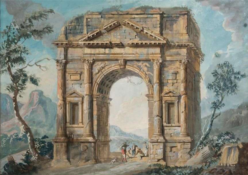 Promeneurs près d'un arc antique