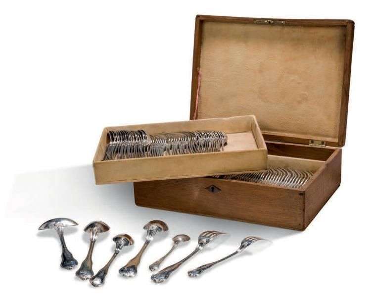 PARTIE DE MÉNAGÈRE en argent à décor de filets contours et coquilles chiff