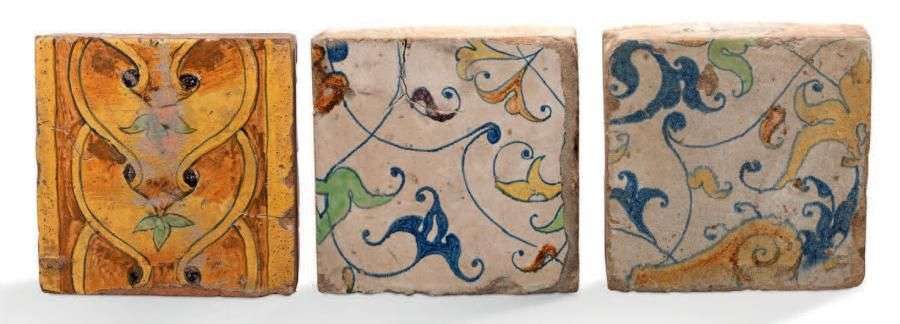 TROIS CARREAUX EN FAÏENCE POLYCHROME attribués à l'atelier de Masseot Abaq