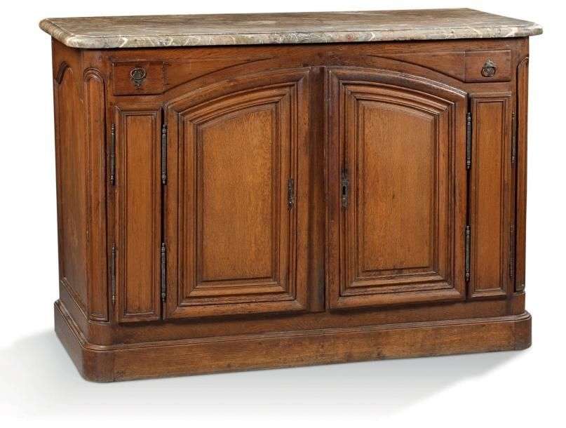 Il est souvent en chêne, couvert d'un plateau de pierre ou de marbre qui sert à poser le gibier, au retour de la chasse. Le décor comme on peut le voir ici est simple, les portes vigoureusement moulurées, arquées en chapeau de gendarme, présentent une ouverture à double évolution.