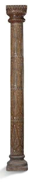 PAIRE DE COLONNES en bois exotique à décor d'incrustations d'ivoire et d'ébène figurant des rinceaux fleuris, végétaux stylisés et frises de motifs géométriques.