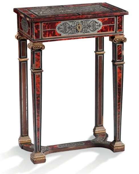 TABLE COFFRET de forme rectangulaire en placage d'ébène marqueté d'écaille rouge dans des réserves et rinceaux d'étain.