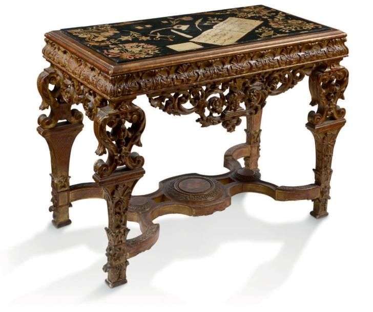 TABLE ornée d'un plateau traité en «scagliole», elle repose sur un piètement massif en bois doré, dont les quatre pieds sont reliés par une entretoise.