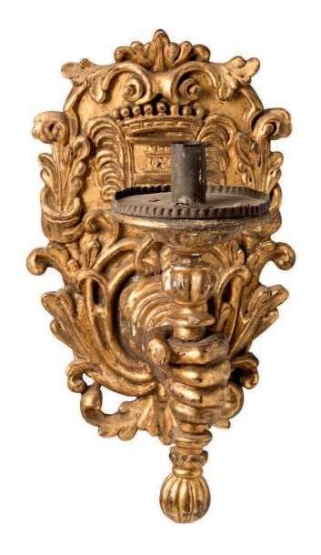 RARE PAIRE D'APPLIQUES en bois sculpté et doré à décor d'un avant-bras tendu, tenant une torche.