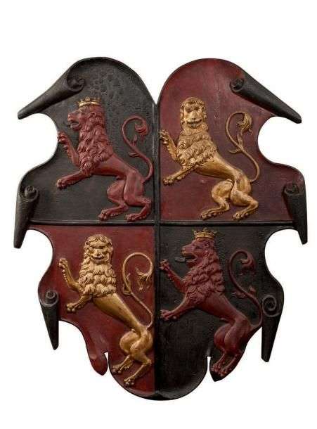 GRAND PANNEAU ARMORIÉ en bois sculpté et peint aux armes écartelées d'une