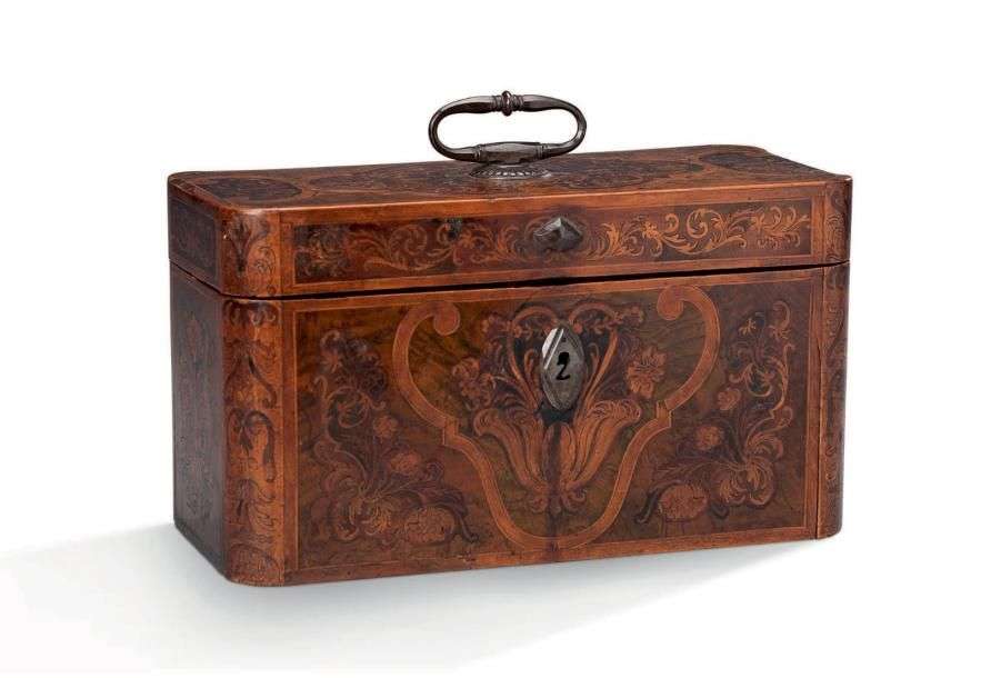 COFFRET À THÉ rectangulaire sur bâti de noyer, entièrement orné de marquet
