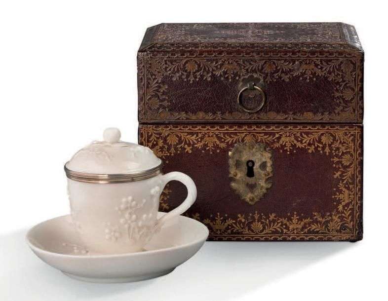 TASSE À SORBET en porcelaine de Saint-Cloud et sa sous?tasse, à décor en relief de fleurs de pommier d'inspiration orientale. La prise du couvercle formée d'une pomme.