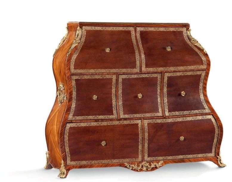 Une riche ornementation de bronzes ciselés et dorés vient décorer les chutes d'angles, les poignées de préhension, les écoinçons, les sabots ou d'agrafes sur le cartonnier