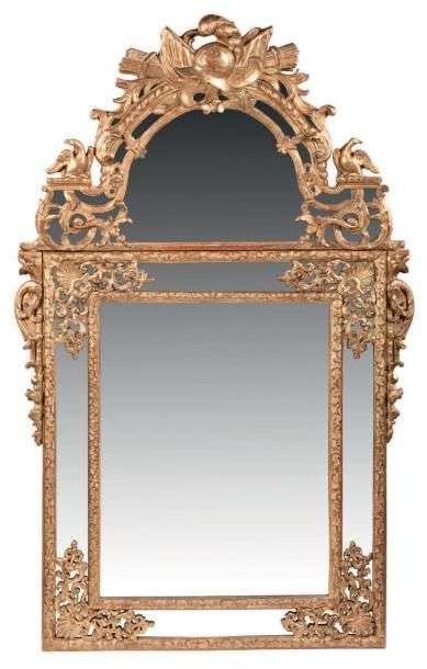 GLACE dans un double encadrement en bois sculpté et doré à décor de quatre écoinçons à coquilles dans les angles.