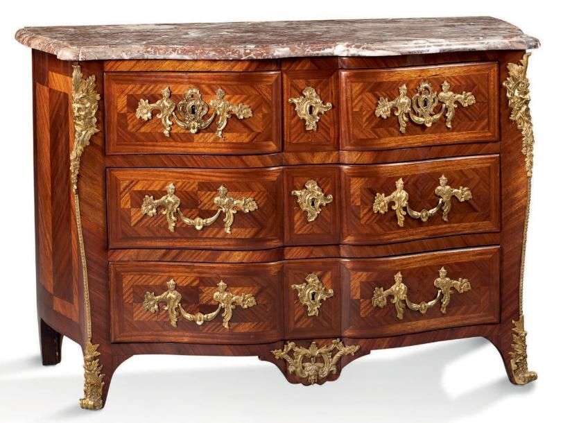 Garniture de bronze ciselé et doré: entrées de serrures, poignées tombantes, chutes à masques et sabots.