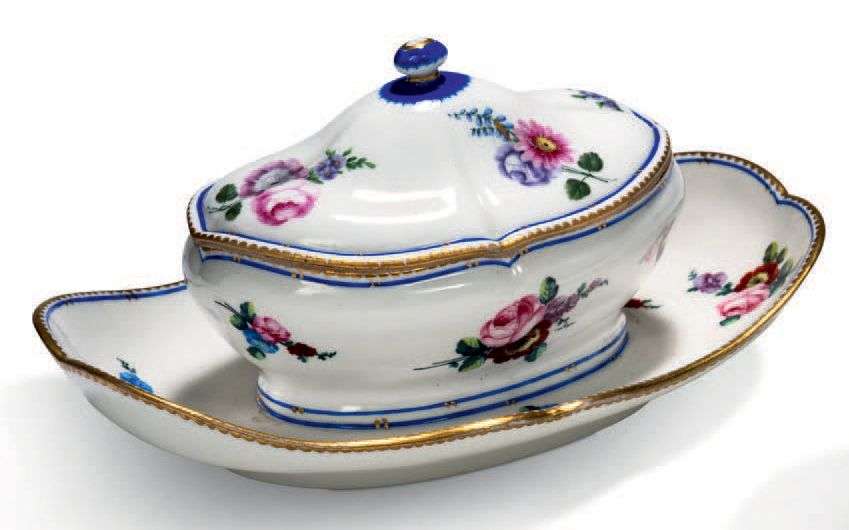 PAIRE DE SUCRIERS COUVERTS sur leurs plateaux adhérents, en pâte tendre de forme oblongue, décorés en polychromie de bouquets de fleurs.