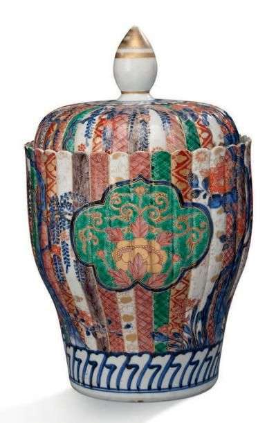 IMPORTANTE PAIRE DE POTICHES en porcelaine polychrome Imari, à godrons.