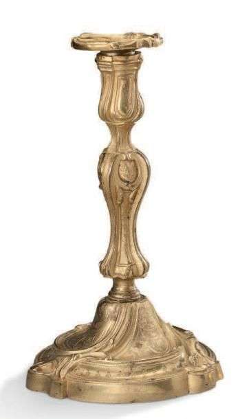 PAIRE DE BOUGEOIRS en bronze ciselé et doré à motifs rocaille de côtes torses, coquilles, acanthes et rinceaux gravés.