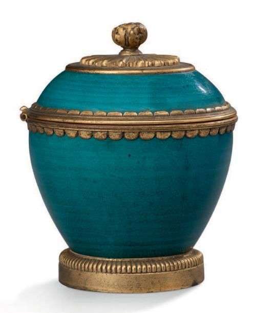 PETIT ENCRIER EN PORCELAINE turquoise. Il est orné d'une monture en bronze doré et ciselé. Prise en forme graine.