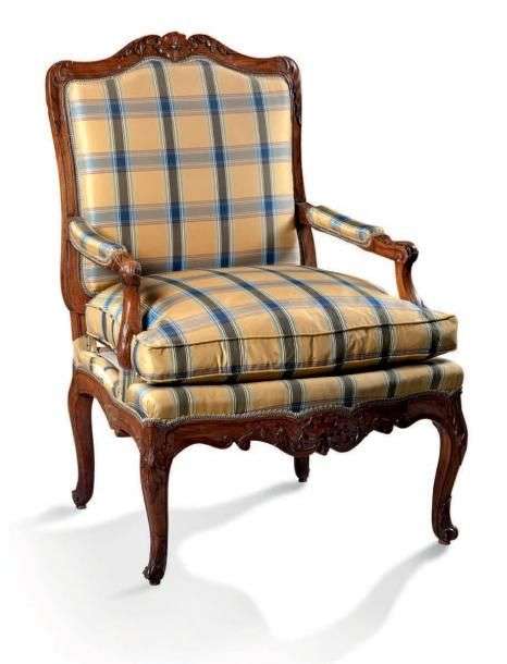 FAUTEUIL À LA REINE en bois naturel mouluré et sculpté.