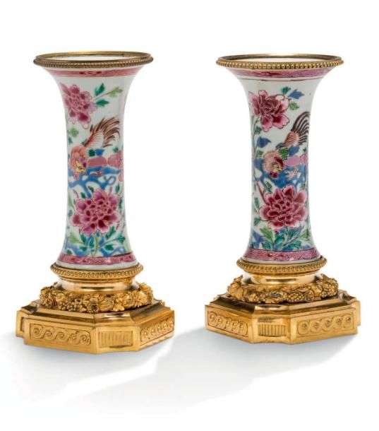 PAIRE DE VASES CORNET en porcelaine décorés aux émaux de la famille rose, à décor d'oiseaux et de végétaux sur fond blanc| montés en bronze doré.