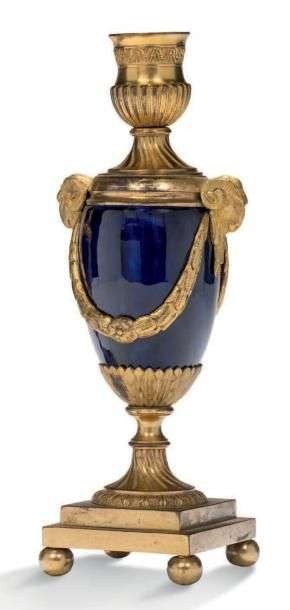Monture en bronze ciselé et doré à tête de bélier retenant une guirlande de lauriers.