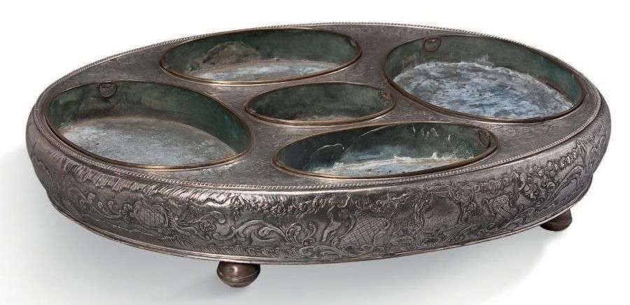 RARE SURTOUT DE TABLE de forme ovale, en laiton gravé, repoussé et argenté.