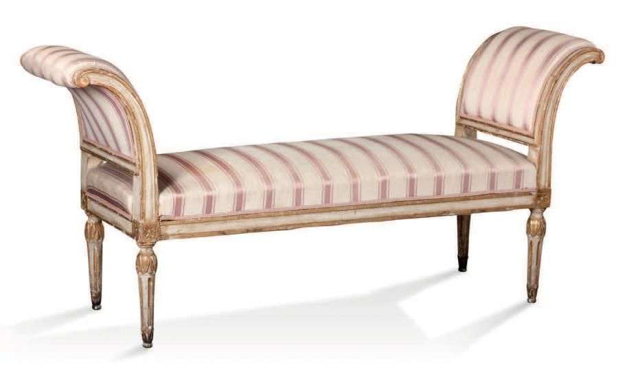 PETITE BANQUETTE en bois peint et rechampi or, à chevets renversés.