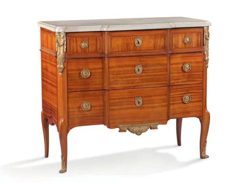IMPORTANTE COMMODE de forme rectangulaire à ressaut central, en placage de satiné. Elle ouvre par cinq tiroirs sur trois rangs, dont deux sans traverse.
