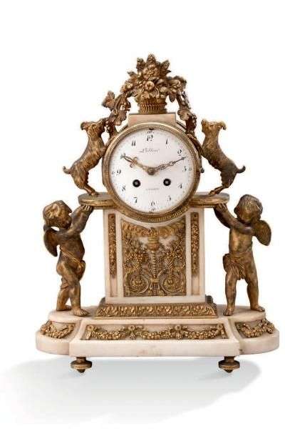 PENDULE BORNE en marbre blanc et bronze ciselé et doré, surmontée d'un vas