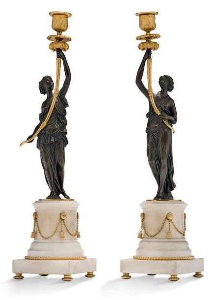 PAIRE DE BOUGEOIRS en bronze patiné et doré.