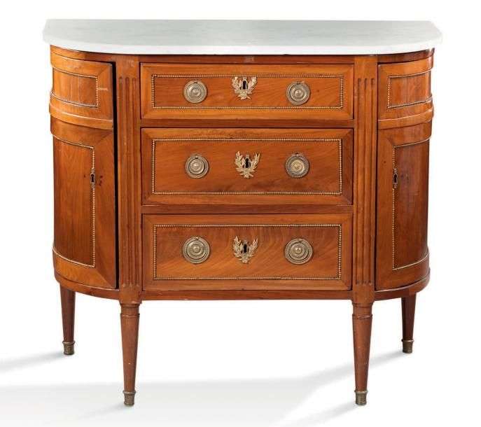 COMMODE DEMI-LUNE en acajou et placage d'acajou ouvrant par trois tiroirs encadrés de deux portes à décor d'une petite rangée de perles en bronze. Elle repose sur des pieds jacob. Dessus de marbre blanc, gris veiné.