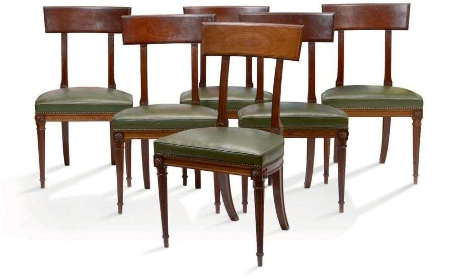 SUITE DE SIX CHAISES en acajou reposant sur des pieds à canaux moulurés à l'avant et sabre à l'arrière.