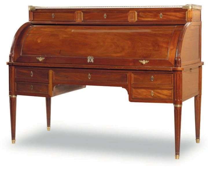 BUREAU CYLINDRE en acajou et placage d'acajou mouluré, il ouvre à trois tiroirs en partie haute, un volet découvrant casiers et trois tiroirs. La tablette à écrire mobile découvre trois tiroirs simulés.