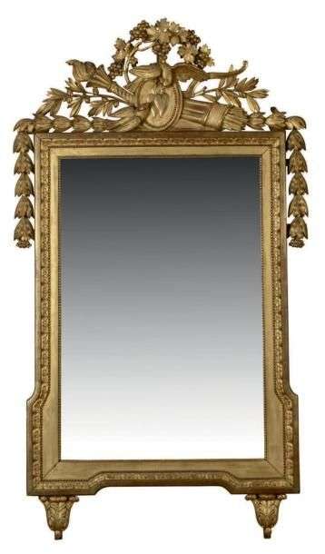 MIROIR en bois doré de forme rectangulaire couronné par un trophée d'amour: deux colombes, accompagnées d'arcs, de carquois et d'un écu aux deux coeurs enflammés, se contemplent dans une végétation de pampres et de guirlandes.Un léger épaulement et deux culs-de-lampe en partie basse viennent rythmer l'ensemble. La glace est bordée d'une frise de feuilles d'eau.