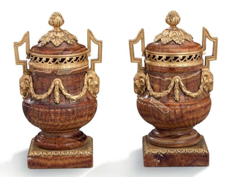 La monture en bronze finement ciselé et doré: le couvercle surmonté d'une prise en forme de graine, la galerie ajourée d'une frise de postes, les anses supportées par des têtes de béliers réunies par des guirlandes de lauriers.