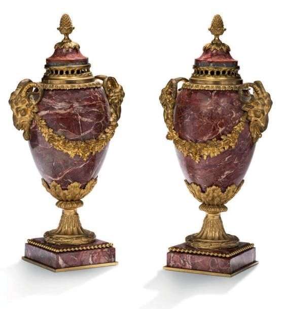 PAIRE D'URNES en marbre rouge et bronze ciselé et doré, les anses à tête de bélier retenant une guirlande de fleurs et feuillage.