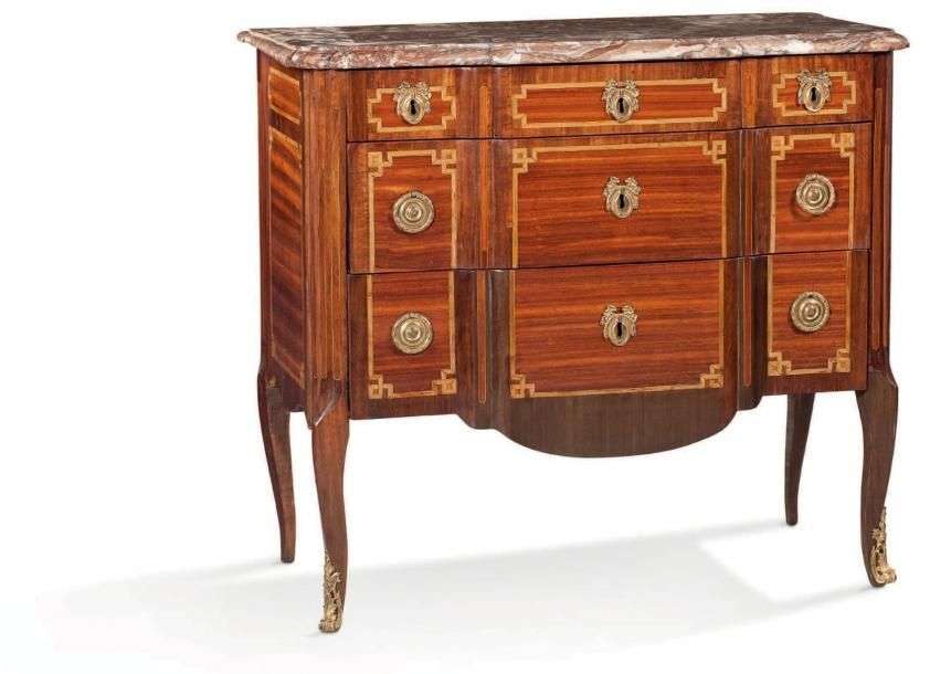 COMMODE rectangulaire à ressaut, en placage de satiné et amarante, dans des encadrements de filets de bois teinté vert à grecques.