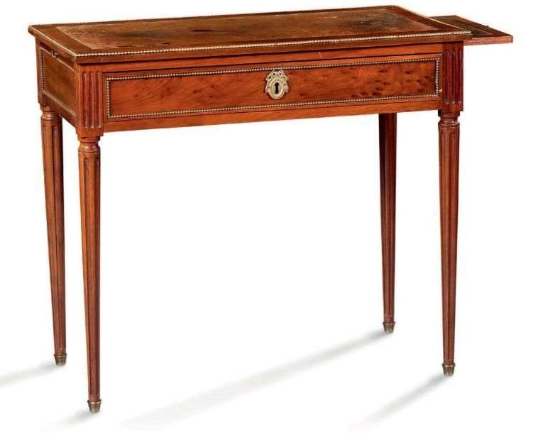 TABLE À ÉCRIRE de forme rectangulaire en acajou et placage d'acajou. Il ouvre par un tiroir en ceinture et deux tirettes latérales. Pieds fuselés à cannelures. Plateau gainé d'un cuir fauve doré aux petits fers. Ornementaion de bronze ciselé et doré.