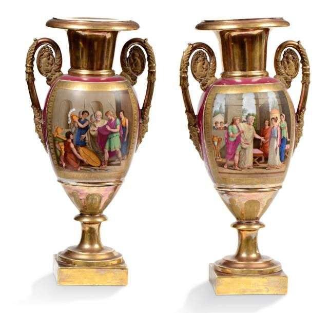 PAIRE DE VASES en porcelaine à fond bordeaux, à décor de scènes à l'antique dans des réserves polychromes figurant d'un côté des personnages et de l'autre des trophées. Ils sont entourés de motifs néoclassiques polychromes avec palmes et camées, reposant sur piédouche et sur socle carré, anses feuillagées se terminant par des putti dans un médaillon.
