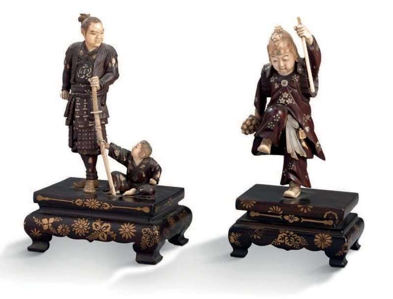 DEUX OKIMONOS en bois incrusté de nacre et ivoire représentant des personnages debouts dont un avec un ken dans une main.