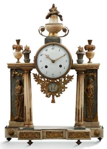 PENDULE PORTIQUE en marbre blanc, marbre gris et bronze ciselé et doré. Le
