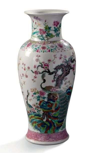 Vase balustre en porcelaine famille rose. La panse est décorée de paons dans un jardin.
