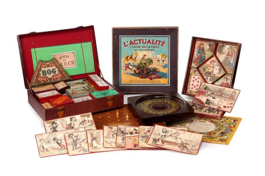 Coffret Jeux Nouveaux comprenant les Boules Ensorcelées - Jeu du Clown - Jeu des Manifestants - le Cochon Fidèle - Tireliboudin - le Petit Jongleur - Jeu de Loto - Jeu d'Actualité - solitaire - boules en bakélite - casse-tête et petits chevaux.